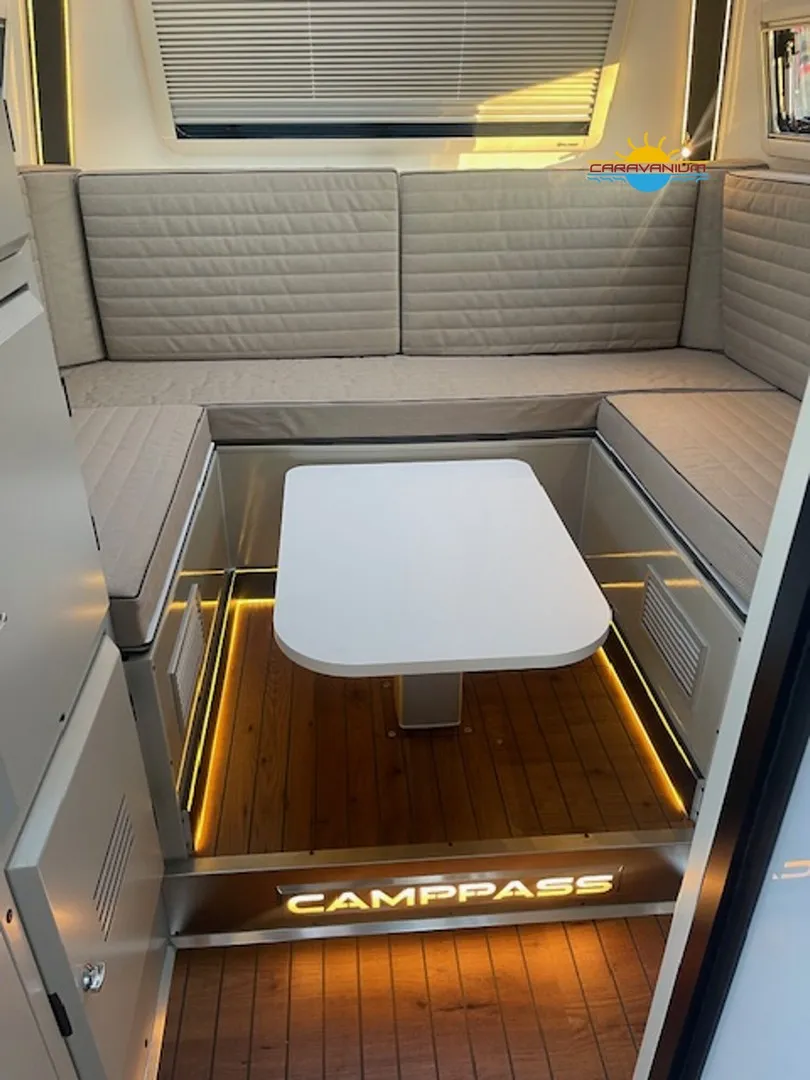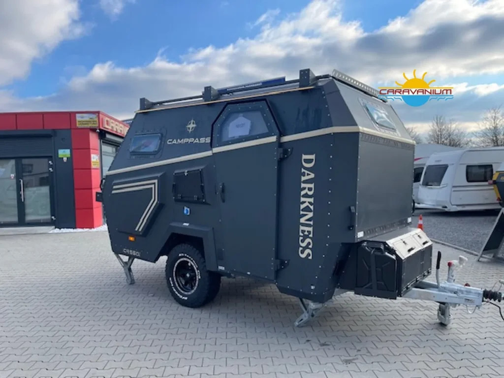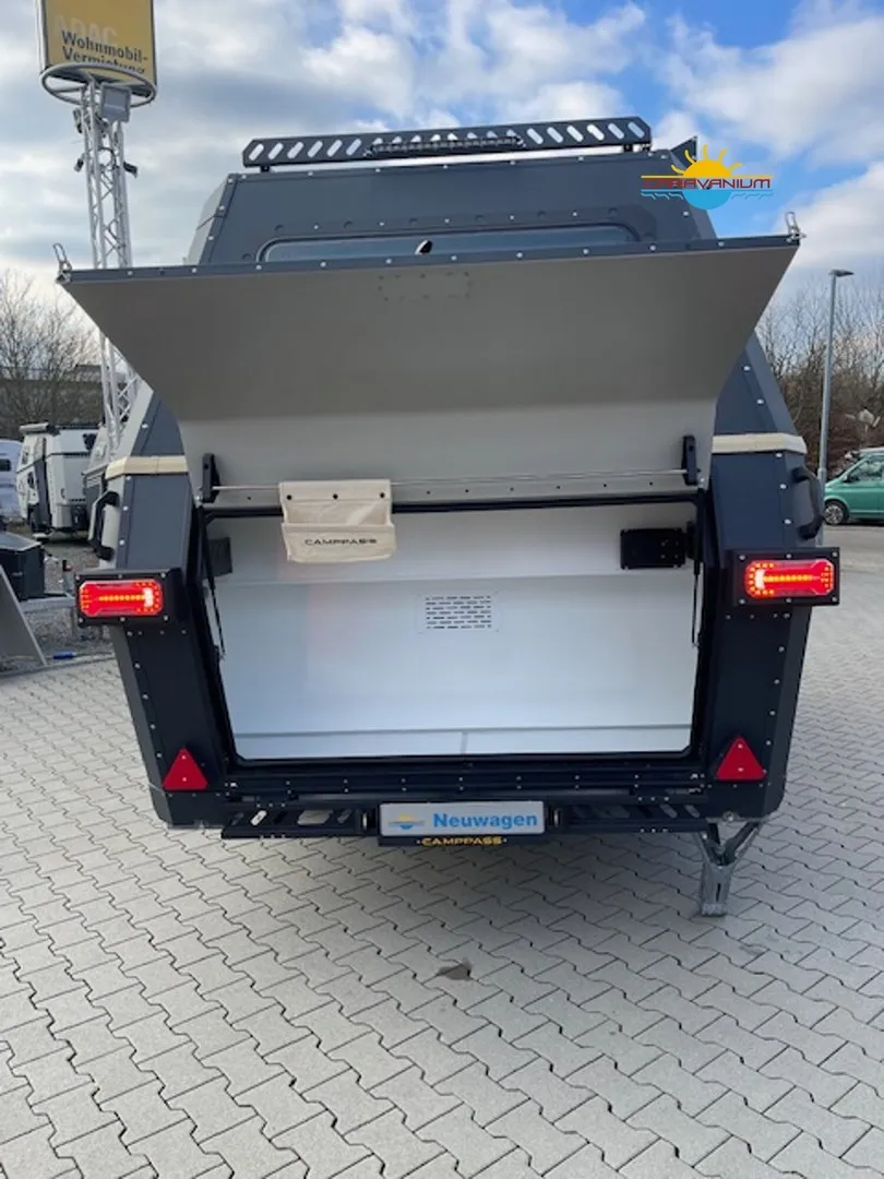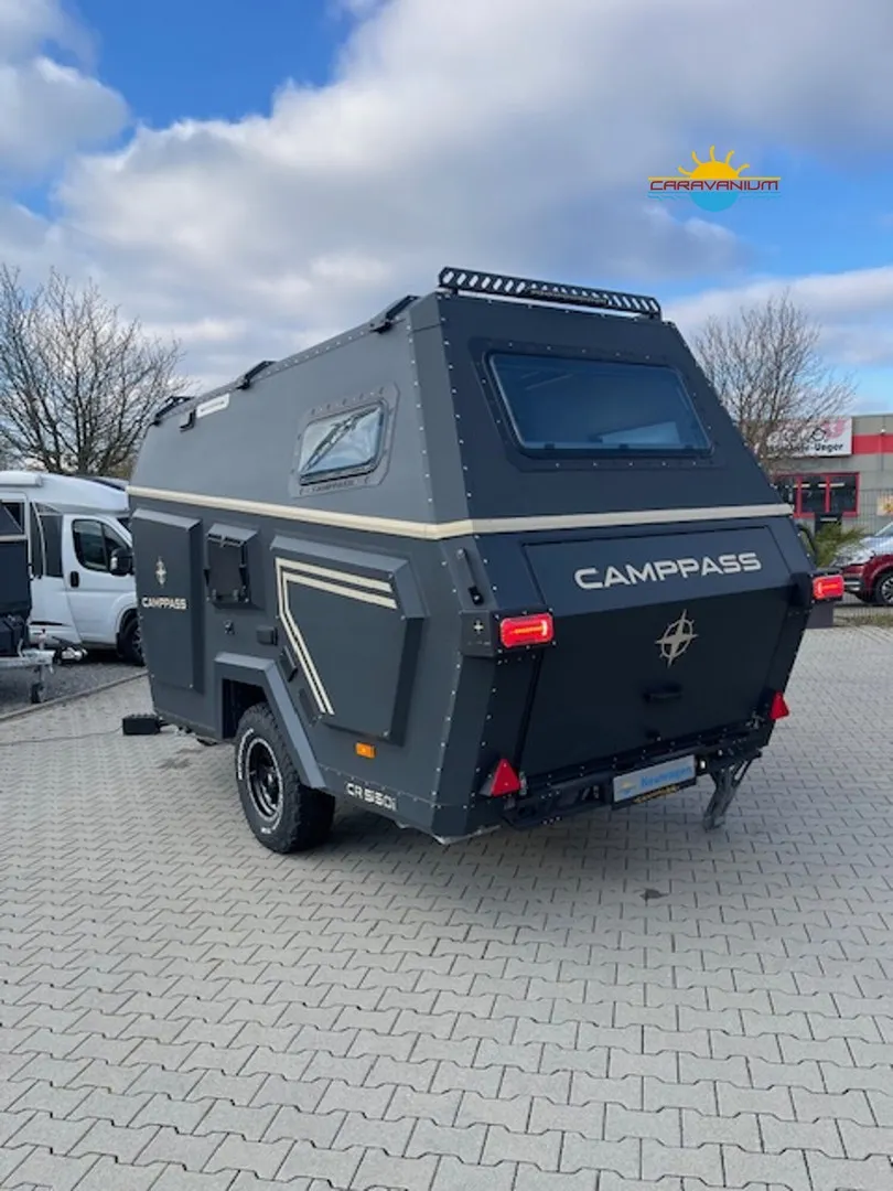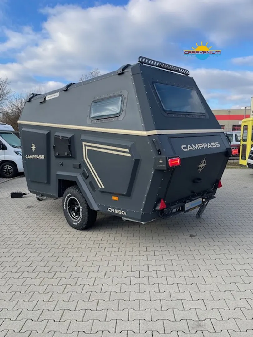 Camppass CR 550 – Geländegängiger Wohnwagen mit Komfort und Autarkie Der Camppass CR 550 ist ein kompakter Offroad-Wohnwagen, der für Reisen abseits klassischer Campingplätze entwickelt wurde. Seine stabile Bauweise und das durchdachte Raumkonzept machen ihn zum idealen Begleiter für Abenteuer mit Anspruch an Komfort und Unabhängigkeit. Serienausstattung: Robuste Offroad-Bauweise mit Bodenfreiheit für unwegsames Gelände Isolierter Aufbau mit modernem Innenausbau Standard-Außenküche (seitlich integriert) Basisbeleuchtung und 12V-Netz Fenster mit Verdunklung und Moskitonetzen Stauraumlösungen innen und außen Reserveradträger Sonderausstattung: Camppass Kombi Diesel Kompakte Dieselheizung mit integrierter Warmwasserbereitung. Effizient, wartungsarm und ideal für kältere Temperaturen oder autarkes Reisen ohne Gasversorgung. Energiepaket 1 – erweiterbare Version 100 Ah Lithium-/JEL-Akku (zweiter Akku optional installierbar) 30 A/h MPPT-Laderegler für Solarstrom 20 A/h Ladegerät für Landstromanschluss 200 W Solarpanel (dachmontiert, extern auf 400 W erweiterbar) 1000 W reiner Sinus-Wechselrichter (bereits auf 2000 W aufgerüstet) Wechselrichter 2000 W Ermöglicht die Nutzung von Haushaltsgeräten wie Kaffeemaschine, Föhn, Induktionskochfeld oder Laptop ohne Landstromanschluss. Fahrradträger Thule Excellent Black Edition Hochwertiger, stabiler Träger für zwei Fahrräder, montiert am Heck. Ideal für sportliche Reisen. Thetford Kühlschrank 90 L Kompressor-Kühlschrank mit großem Nutzvolumen und zuverlässiger Kühlleistung – auch bei hohen Außentemperaturen. Tablet (Steuerungseinheit) Zentrales Bedienelement zur Steuerung und Überwachung verschiedener Bordfunktionen wie Stromversorgung, Wasserstand, Heizung oder Licht. Porta-Potti 565P (tragbare Toilette) Mobile Kassettentoilette mit integriertem Spülsystem, ideal für flexible Nutzung ohne festes Badezimmer. Zweite Küche (Indoor-Kitchen) Zusätzliche Innenküche für die Nutzung bei schlechtem Wetter. Ergänzt die Standard-Außenküche um mehr Flexibilität beim Kochen.